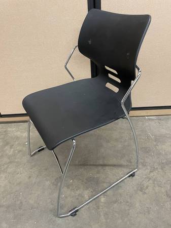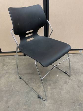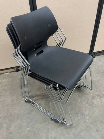 We have four of these stacking chairs available - all in fair/good condition ($25 each). They would be in excellent shape, other than the minor scratching on each chair. It's from stacking them (the silver block on the back hits the seat of the chair underneath it. Other than that though, they're in good shape. We will sell them cheap because of the marks though. The table shown in the photos is also available.