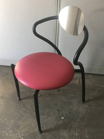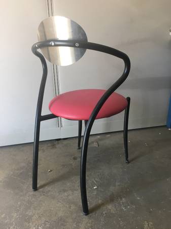 We have 3 of these stacking chairs available - all in good condition ($25 each). They're pretty unique looking - pretty cool. They have a red vinyl seat, black frame, and a polished metal back.