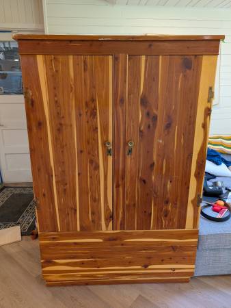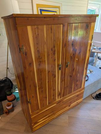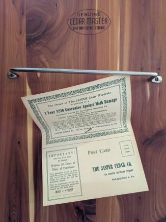 A true mid-century treasure: 1957 Jasper Cedar Master wardrobe in solid aromatic cedar, complete with original paperwork and interior branding. These pieces were built to last a lifetime, and this one has survived nearly 70 years with its striking striped cedar grain intact. Loads of storage space inside for clothes, blankets, or seasonal gear.