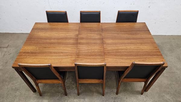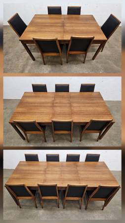 Check out the clean and crisp design lines on this gorgeous walnut table with two leaves and eight solid walnut chairs by Dillingham