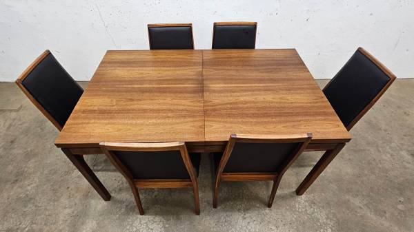This set has been freshly restored to excellent condition just in time for the upcoming holiday dining season. Every inch of the table was stripped, sanded and sealed and the chairs all feature brand new black vinyl upholstery and memory foam seat pads.