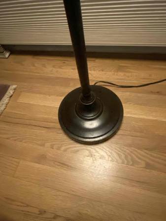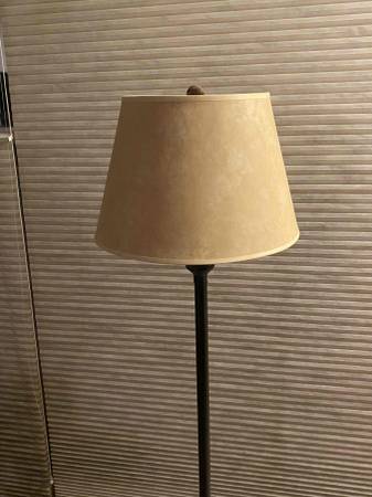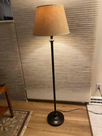 Gorgeous and sleek black metal floor lamp with neutral-toned shade-goes with any decor. Has 3-way bulb to vary the light and a super-long cord - 83". Great reading light or accent lamp. Tons of character!