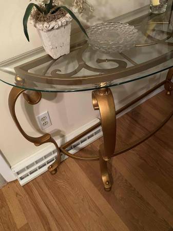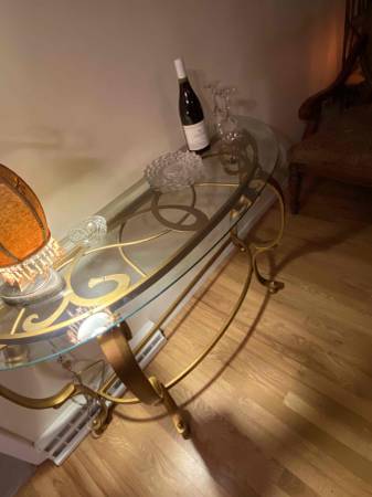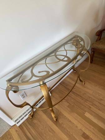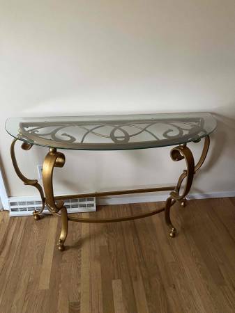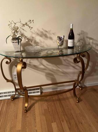 Beautiful and unique! Has a scrolled Art Nouveau design on top with pristine beveled glass and curved legs, Perfect for entertaining - serving cocktails and food- or use it as a sofa table, entryway table, sideboard or buffet. Bronze/goldish tone. Most likely from the 1980s. Extremely well-made and heavy. Check online- hard to find one like this-plus, no shipping charges. Gorgeous!