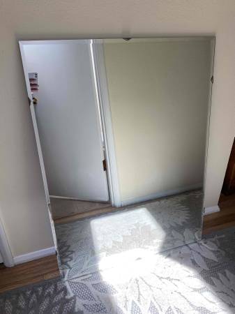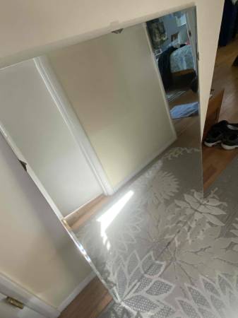 Unique and huge vintage beveled glass mirror in outstanding condition-no mars or scratches. Has triangular metal clip mounts and metal hangers in the back to hang horizontally or vertically. Very heavy and well-made- the pictures do not do it justice! Makes any room appear larger! Perfect in any room in your home. Gorgeous!
