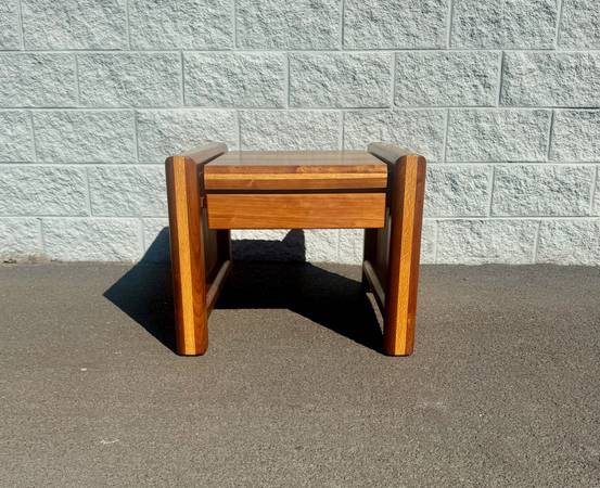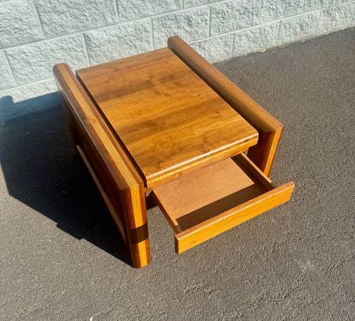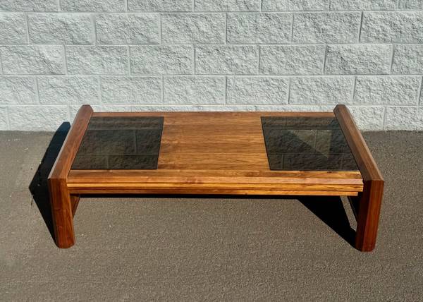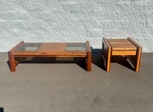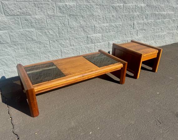Vintage Mid Century Modern style coffee and side table in rich walnut with oak accents and smoked glass top inserts. Unmarked but clearly high-quality with heavy, solid woods expertly joined . Gives off a 1970's Scandinavian Modern meets Percival Lafer meets Lou Hodges vibe. Will consider selling separately but it would be a shame to break up this rare set.