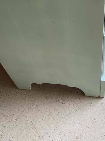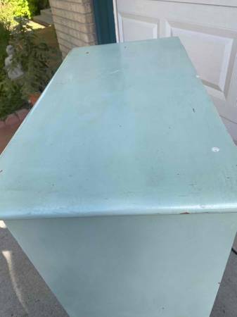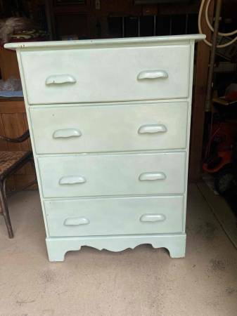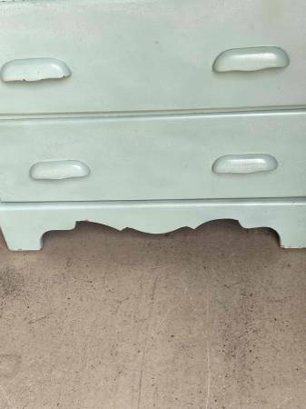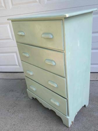 Gorgeous and unique solid wood vintage dresser with 4 dovetailed drawers. Heavy and well-made in a blueish/green color. Has decorative notched details on the bottom front and both sides and original handles. Insides of drawers look brand new-beautiful wood graining and are super-clean! Holds a ton of stuff. Great as it is - or paint it to match your decor. One-of-a-kind!