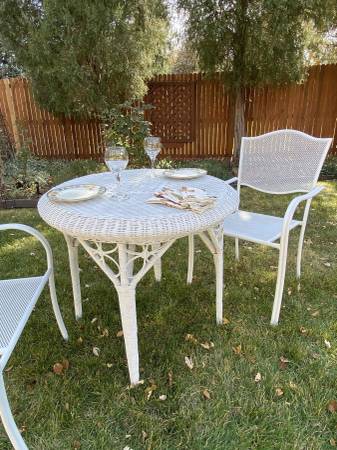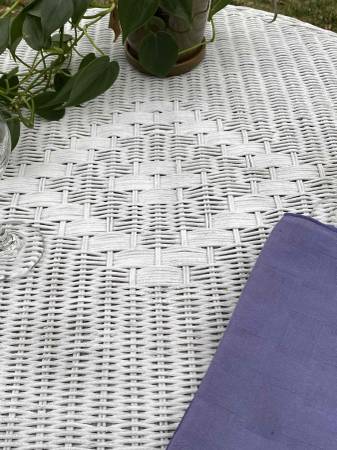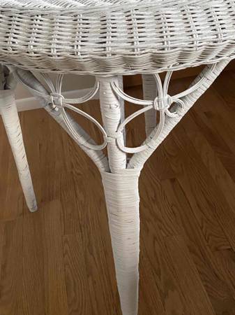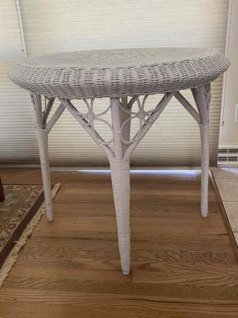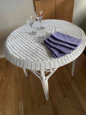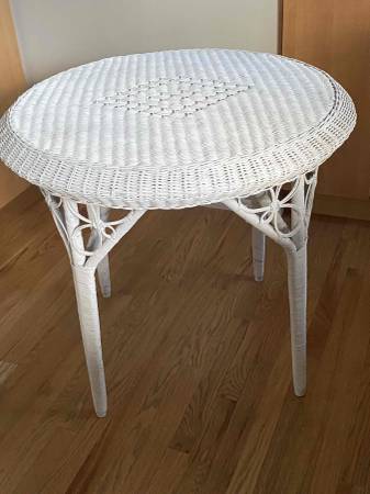 Beautiful vintage small dining table, large end table, nightstand, bistro table, patio table or plant stand! Has a lovely woven top with a basket weave design and curved accents on the table legs. Great to have on hand for extra guest seating or to use as a serving table. Perfect for small spaces. Sturdy - yet lightweight enough to move around -is a bit larger than it looks in the photos. Could also make it larger by putting a round glass top on it. Gorgeous and unique!