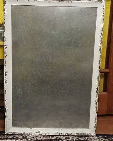 Galvanized MAGNETIC Board is framed in white chippy paint wood frame.