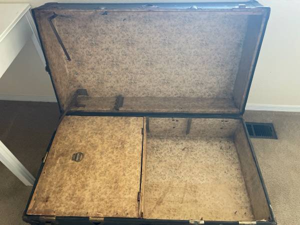 Antique closet trunk wood and leather. Marked FHH.