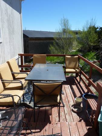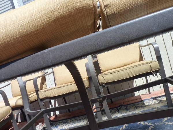 The cushions are 2 parts for each chair and are a yellow beige color. Cushions have clips that hold it in place. I had none blow away during the wind storm but a few may be getting brittle