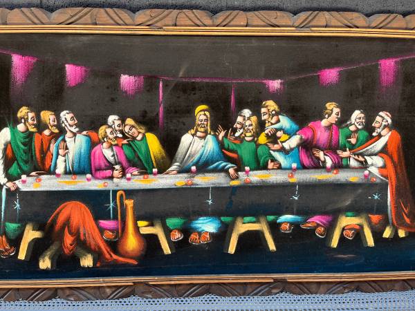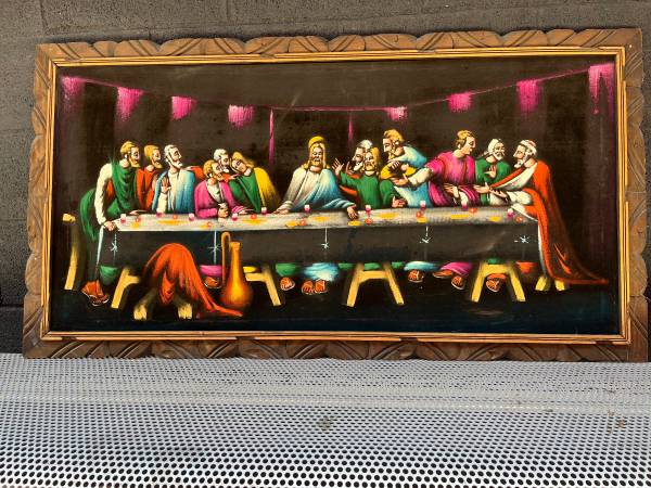 The Last Supper - Vintage from 1960’s or 1970’s black velvet. The vivid colors and artwork make this a very unique black velvet. Cool carved wood frame, not in perfect condition, but for the age is amazing. It is large at 49” wide by 26” tall.