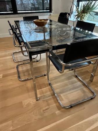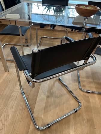 Have 6 available- will sell all 6 for $500. They are an elegant mid century modern design. In great shape, one chair has some minor cracking of leather on back (see photo). Chairs only, table not...