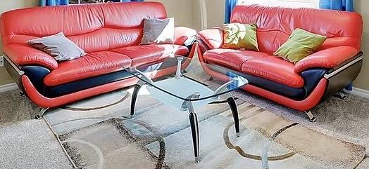 Two stylish red leather couches for sale! The larger couch has a tiny scratch on the side but that is the only damage these couches have. Just needs a wipe down! The glass table is a little wobbly but probably just needs to be screwed in better. The table is also free with purchase of the couches! 400 or best offer. Selling both as a set.