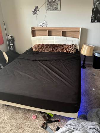 Brand new basically, led lights underneath with remote. Must pick up and unassemble yourself.