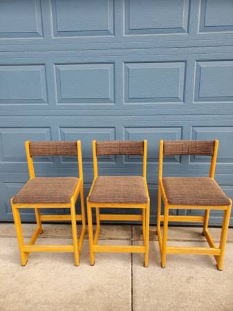 Three vintage Danish Findahl Mobler A/S counter chairs. Great condition. 24-inch seat height; 17x15.5-inch seat size including wood edge; 35.5 inches to top of seatback. All three as a set for $225...