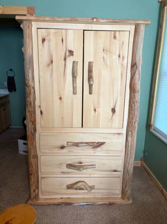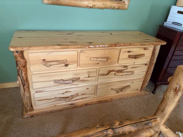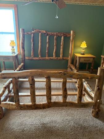 In great shape is a full wood / log furniture set including a queen size aspen log bed frame with matching dresser, night stands, armoire & wood framed mirror. Would like to sell the set as a whole but will entertain offers. LMK if you have ?'s or offers, Thx for lookin.