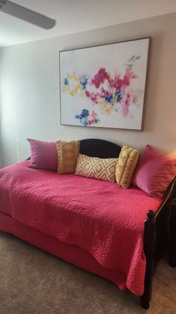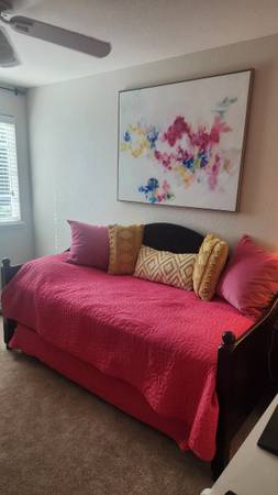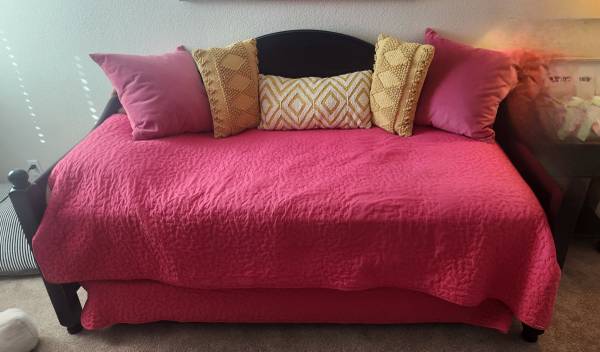 Twin daybed with trundle for sale. Black. $150 Two twin mattresses for sale in addition to the bed for an extra $100 (for 2.) Pink blankets, pillows, picture also included if purchase both the bed...