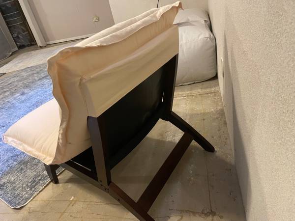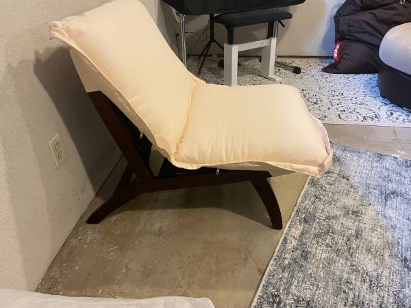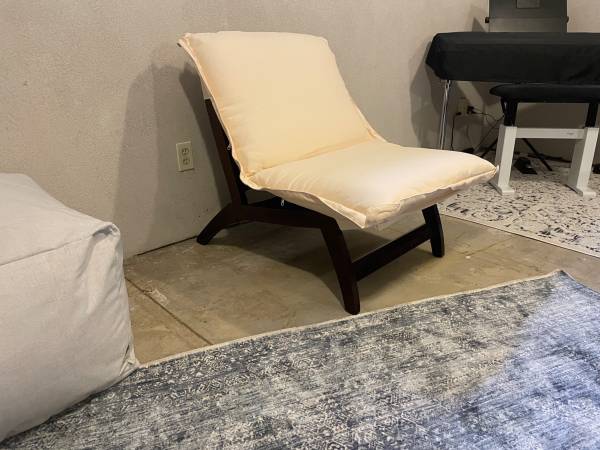 Brand new lounger chair Dark brown wooden chair with removable/washable peach-colored cushion. (Cover has more of a peachy hue than the photographs show.) Cover unzips to allow for removal of...