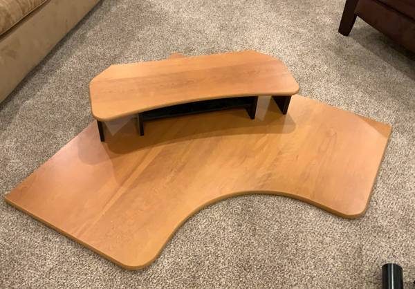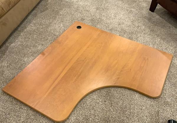 Corner computer/study desk. 47x47x66(at widest point) $40 Text: (will not hold) Cash only!