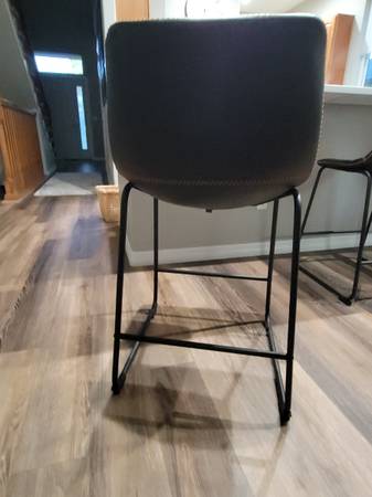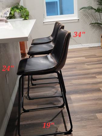 $75 ea. or all three for $200! Black, faux leather counter height bar stools with brown stitching and black metal base/legs are in excellent condition. Chairs are 34" floor to top of back/24" floor to seat, 18" wide and 19" deep at floor level. These are very comfortable to sit in with curved seat and back. Cash only; pick up at my location.