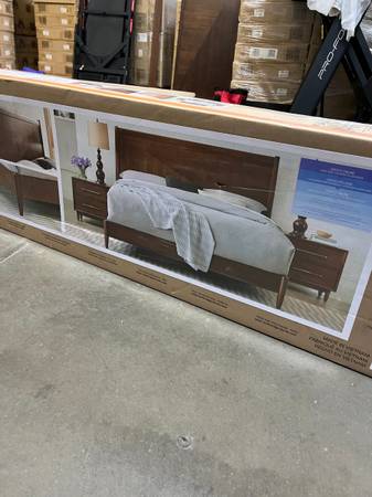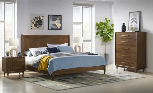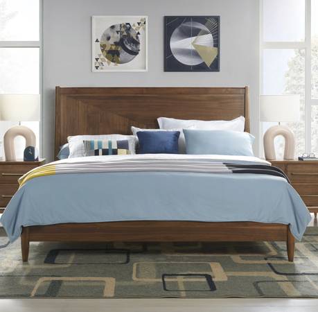Mid-Century Modern at its finest, the Marina Del Ray Cama Queen bed features all the quintessential features of this ever-popular design aesthetic. Constructed of hardwood solids and walnut veneers, this bed features a unique split veneer pattern on the panel headboard and cylinder tapered legs that are the signature mark of mid-century design. Marina Del Ray adds sophisticated funk to your bedroom.