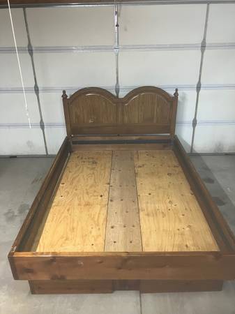 Complete Queen sized wooden bed frame w/under-bed drawers (6).
