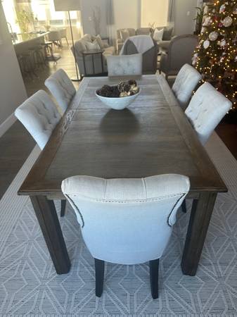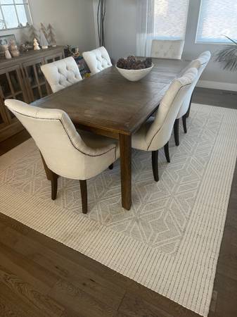 Beautiful Restoration Hardware dining set includes a solid wood table and 6 upholstered chairs. Timeless design and high-quality craftsmanship.