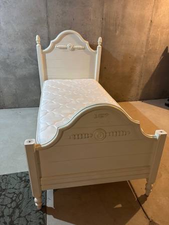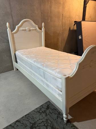 Comfortable twin bed set, with frame, mattress and boxspring.