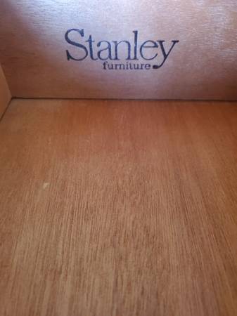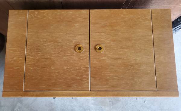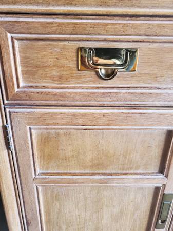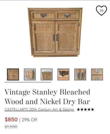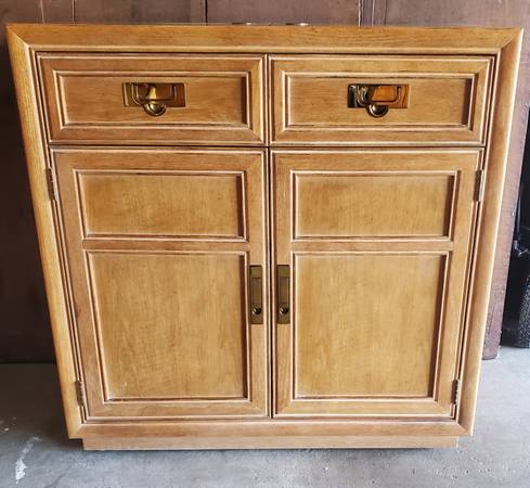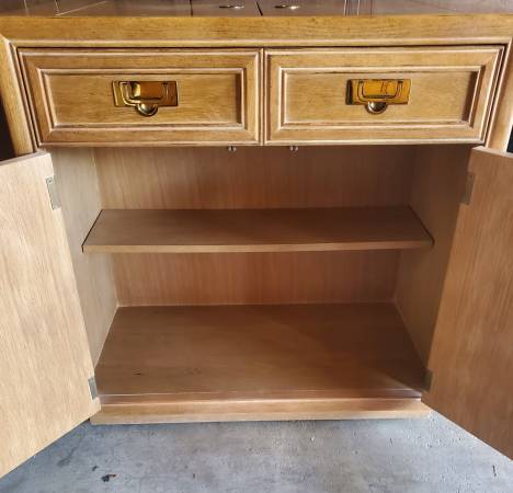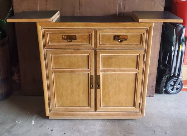Mid-century Stanley bleached wood vintage dry bar on casters, with great brass hardware. Top panels open for added serving space, with bar storage underneath. Stamped Stanley Dimensions34ʺW × 18ʺD ×...
