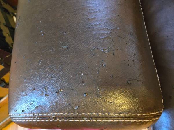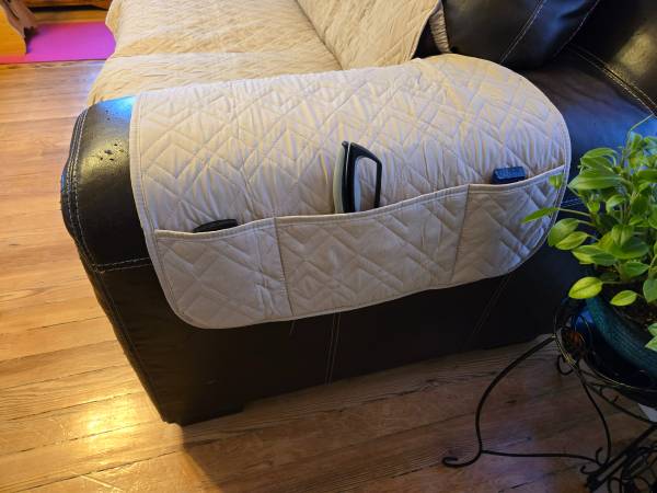 It comes with a new tan padded cover with straps to hold in place and has wings over the armrests with 3 slots for remotes. This does cover most of the damages.