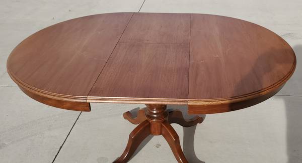 This is a beautiful dining table that has an inlaid design around the center of the table. I believe that it is cherry wood. It is 44"round but has a 15"leaf hidden under the table that when opened makes the table oval and measures 44"wide x 59"long. It is 30"high. It has a pedestal base that has 4 legs. The table top has been refinished and has a polyurethane finish for maximum protection. The base has been restored back to its original finish. It has a very fine inlaid design in the middle of the table that is a circular pattern of small leaves. I was told that it was made at the Hickory Chair Company which makes high quality furniture. If interested call Sharon at the number listed in the reply box. (Seven One Nine-488-Three Seven Seven Eight). This is a land line so will not accept texts. I do not respond to emails or texts and will delete this ad as soon as it is sold. Check out my other postings by clicking on the "more ads by this user" box on the right side of the ad under the map. Cash Only Please! Thanks for looking!