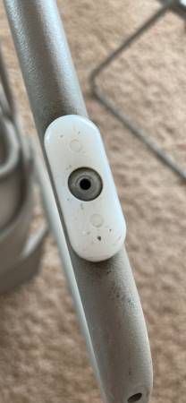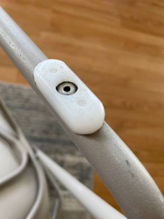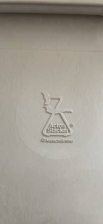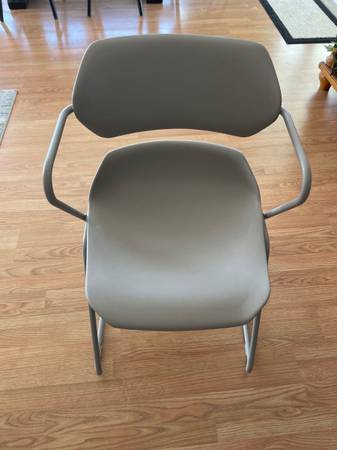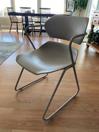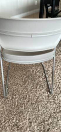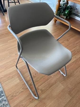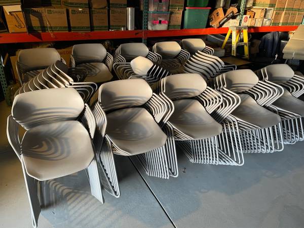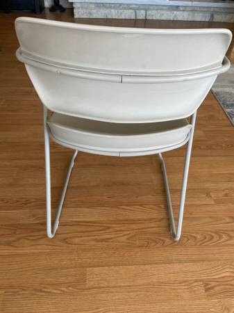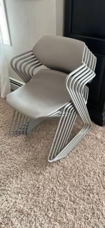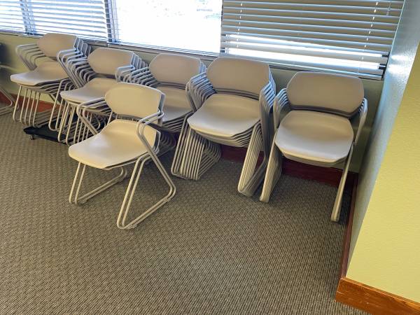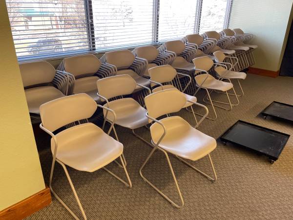Chairs have a gentle rock to them by design. Easily stackable for storage. Dimensions: 21" W x 21" D x 30" H x 16" Seat Height. Good Condition with small imperfections. $10 each, 44 Available. Located 5 miles east of Parker.