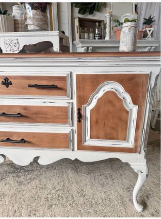 Cute and unique sideboard / sofa table / buffet She measures: 56” L x 34.5” T x 19” D Mirrored top portion measures: 48” W x 38” T and only 6” deep ** 2 - pieces ** Located in Very East Parker...