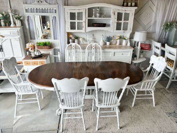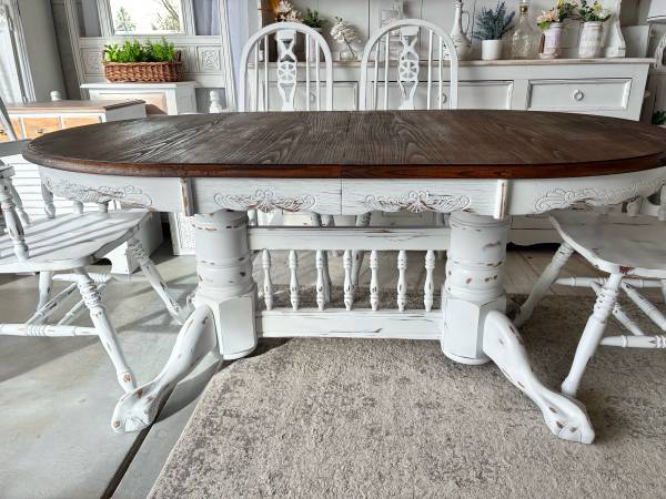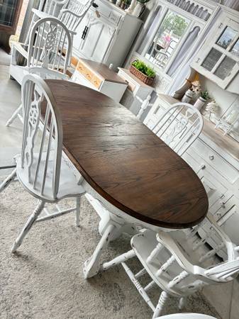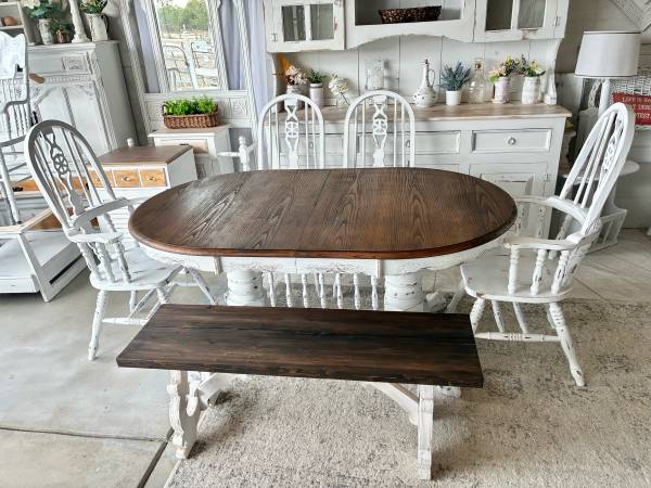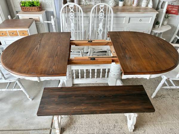 This dining / kitchen table is available with the option of several different chairs and / or bench ! Measures: 88” x 42” (or remove the leaf for a 66” long table) (Base is removable for transport)...