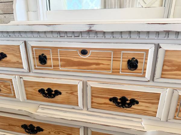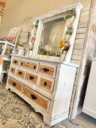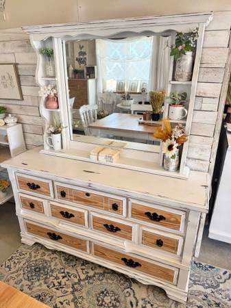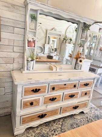 This dresser could also serve as a unique entryway buffet Measures: 61.5” L x 33.5” T x 18” D Top piece: 38” T x 50.5” L Located in Very East Parker * Spring’n Creations *