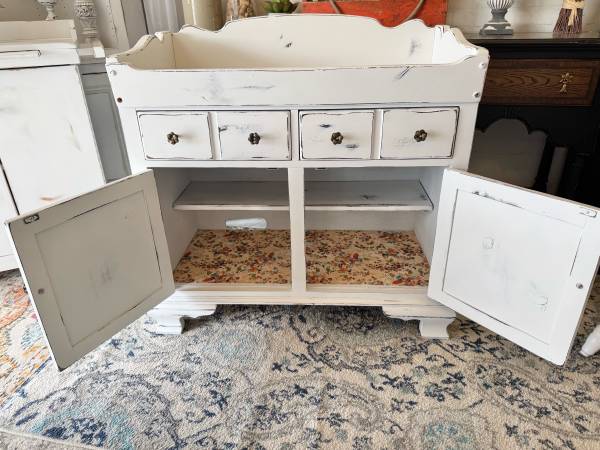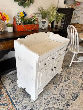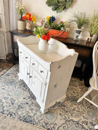 This is an Ethan Allen Dry Sink / Bar ! Uniquely adorable with an adjustable shelf in the lower cabinet. Measures: 38.5” W x 18” D x 32” T (Bronze and rhinestone knobs) Located in Very East Parker...