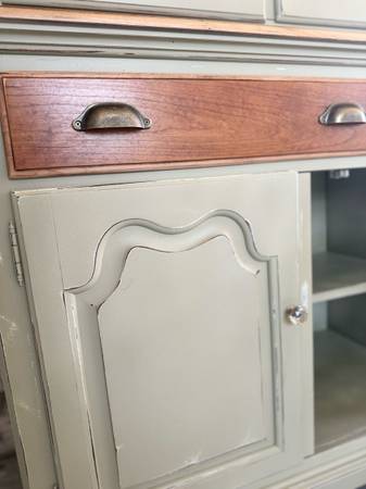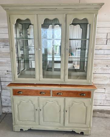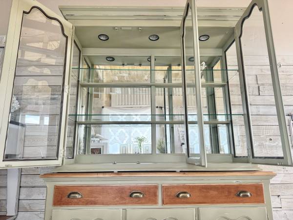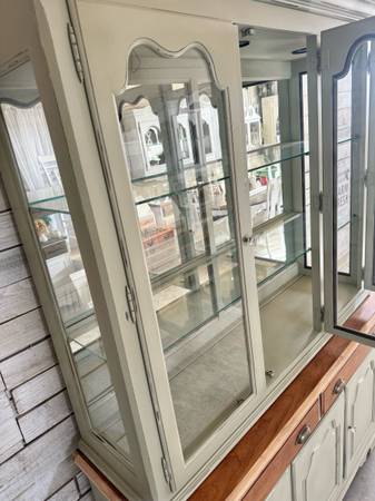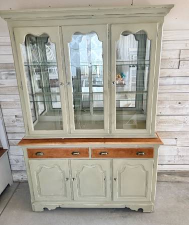 A great solid wood Hutch - Curio - Pantry - Buffet Cabinet by Thomasville. Nice light sage green (distressed with hints of white) Has lights inside ! And 2 glass shelves Measures: 55.5” L x 80” T x...
