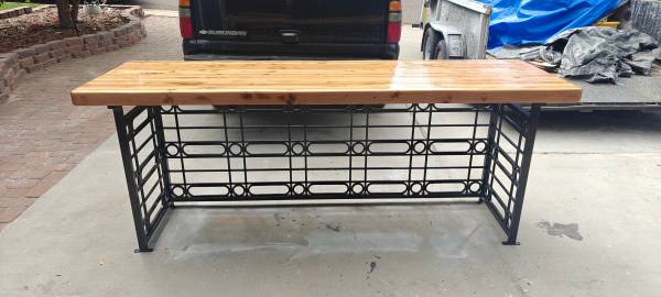 1 of a kind outdoor patio butcher block bar or table, very heavy, 2 5/8 thick top. 5 coats spar urethane. Artistic steel frame. One of a kind. Can be bolted in place to concrete or decking.