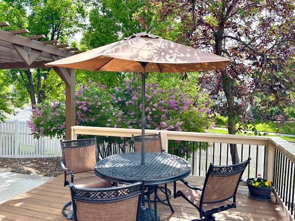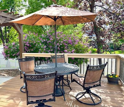 Nice Metal Patio Furniture Set to include a table, 4 sling-back swivel rocker (360-degree spin) chairs, and umbrella (stand not included). The set is in very nice condition and the 7.5-foot push button tilt umbrella works properly. Table is 47 inches in diameter and almost 30 inches tall.
