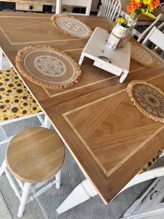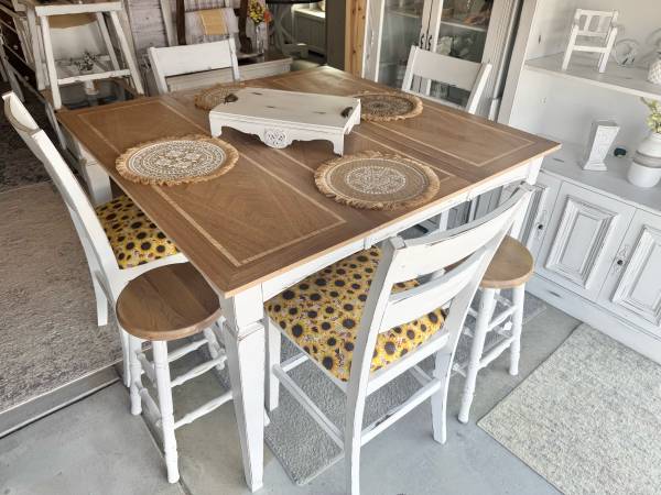 Shabby counter height kitchen table with 4 chairs. Table is 54” x 54” (leaf no longer able to fold inside) and stands 36” tall. Can also include 3 stools for an additional $150. Located in Very East...