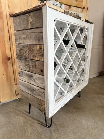 A super rustic and cute wine storage shelf / cabinet measures: 26.5” L x 12.5” D x 30.75” T (Doesn’t have to be used for just wine, would be adorable with bouquets of flowers too) 🌼 Located in Very...