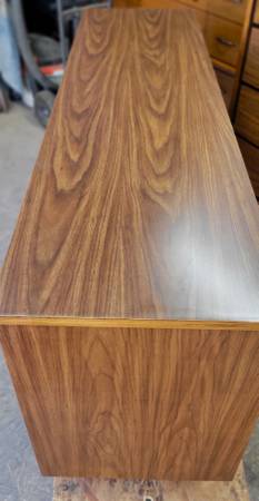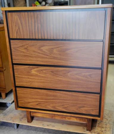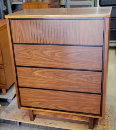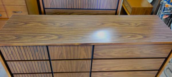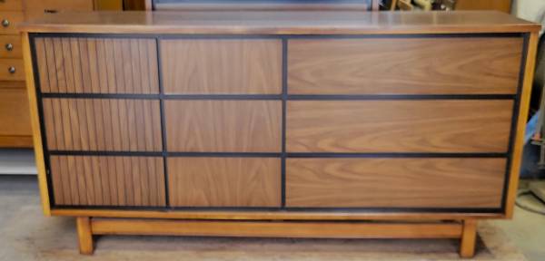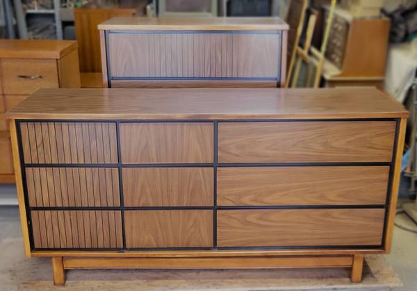 Great looking original condition MCM dressers, mirror and queen headboard. All drawers work as they should. No makers mark that I could find. The 9 drawer dresser is: 60"W x 18"D x 30"H. The 4 drawer tallboy is: 34ʺW x 18ʺD x 42ʺH. Price is for the set, will not separate. Can deliver locally with full price offer and delivery fee TBD, cash only. See my other ads.