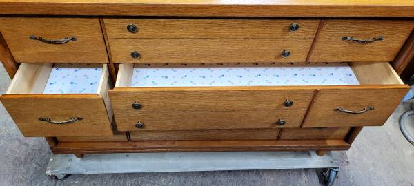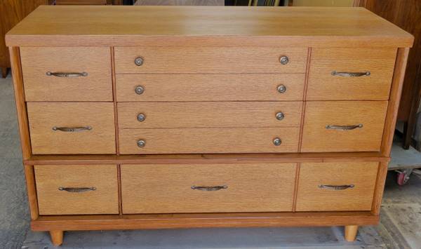 Nice refurbished MCM 6 drawer dresser. All dovetail drawers work as they should. No makers mark that I could find. The 6 drawer dresser is: 62"W x 18"D x 34"H. Can deliver locally with full price offer and delivery fee TBD, cash only. See my other ads.