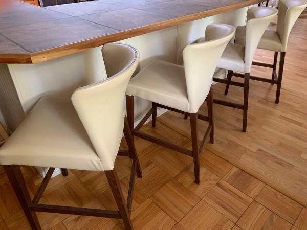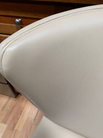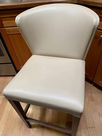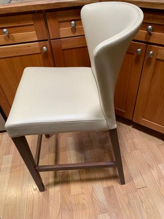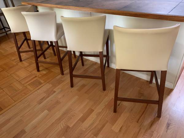 Four cream color "Curran" counter height stools originally from Crate and Barrel. Price posted is for all four stools. We are not selling as individual stools. The stools do not swivel. All four are in excellent condition. Upholstered in vinyl with a polyurethane seat pad.