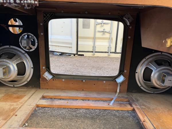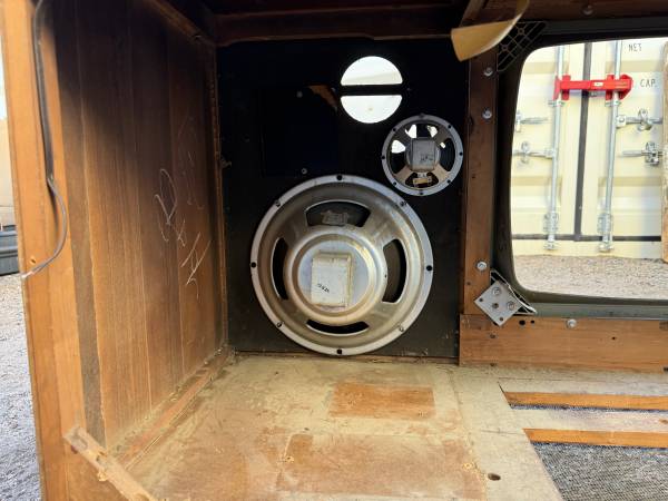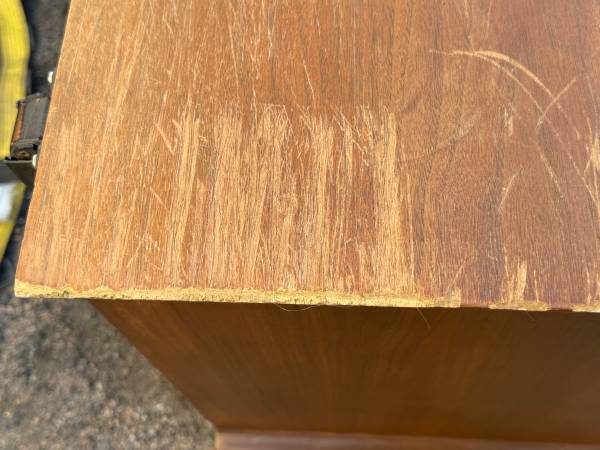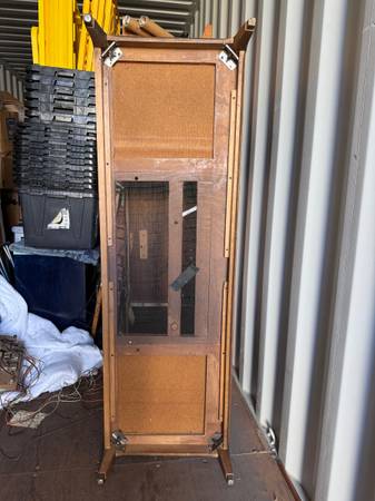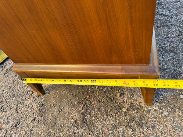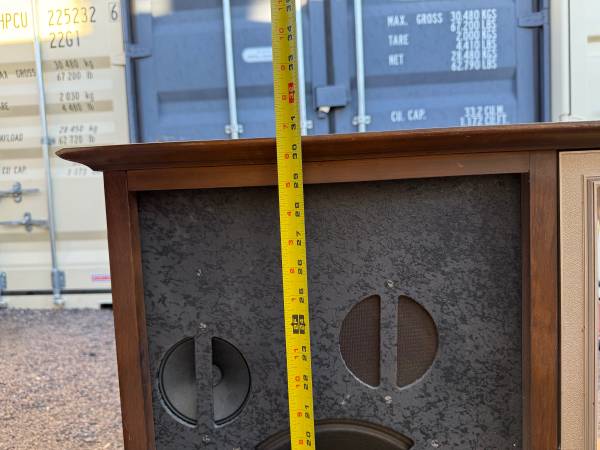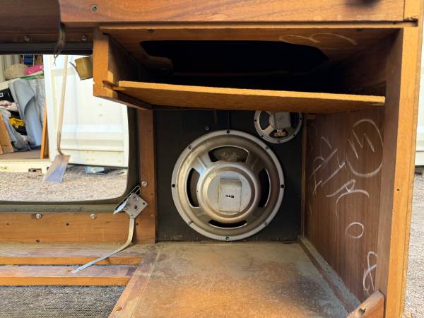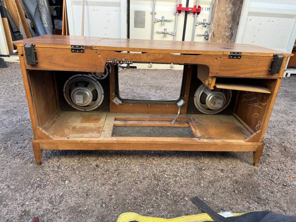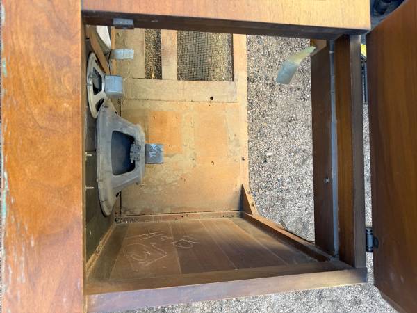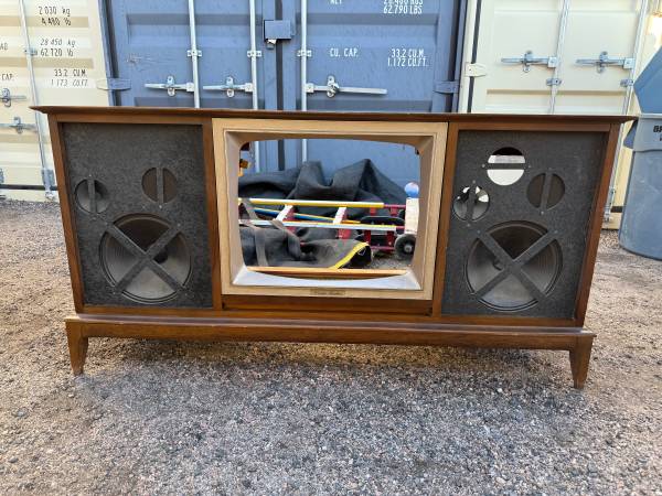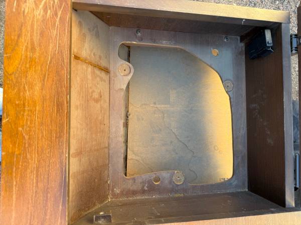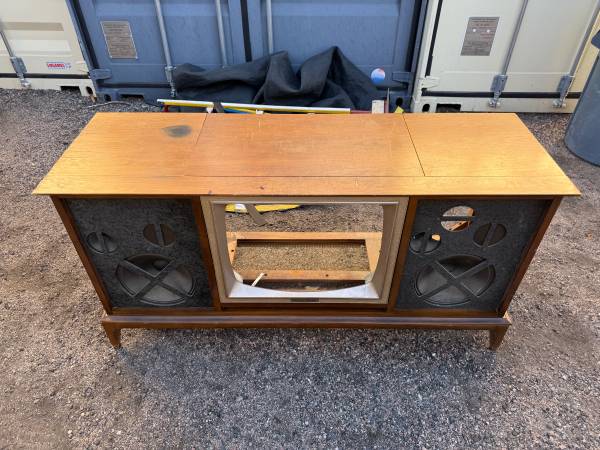 Hi, I have a Mid Century Curtis Mathes TV Console for sale. It is only the frame. It does have scratches and nicks on the top. A couple cigarette burns. It hasn’t been smoked around in awhile. Nicks by the top left edge. I don’t have any type of covers for the speakers. It could be repurposed into something else. Neat Retro Stereo Cabinet Re-do project. Would be a very neat Bar, fish tank, shelf, or dog bed, cat condo, Planter, Etc.