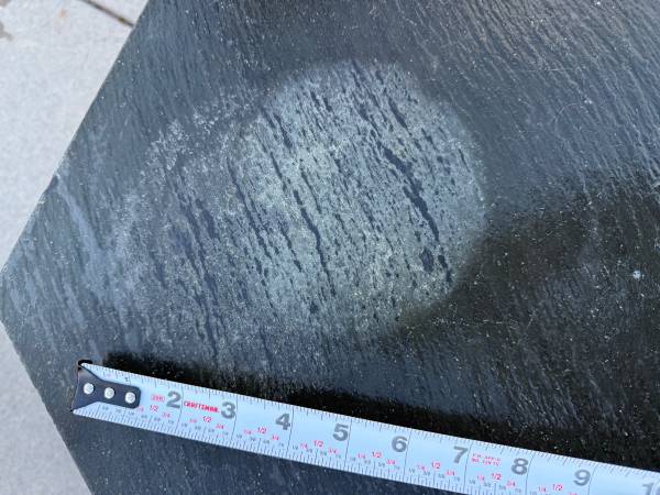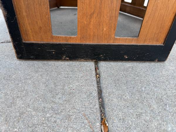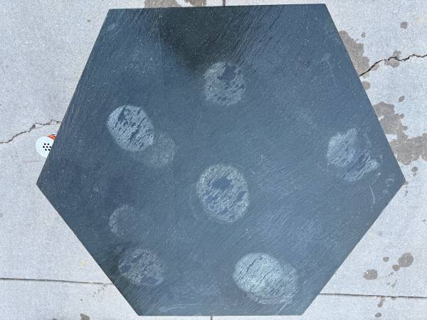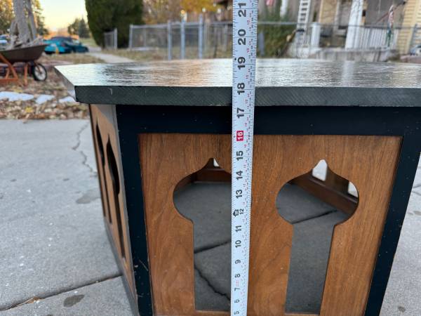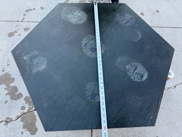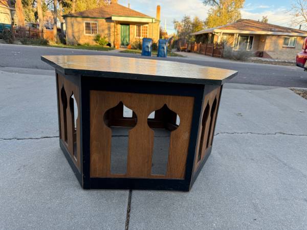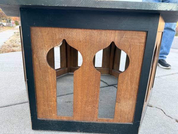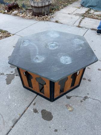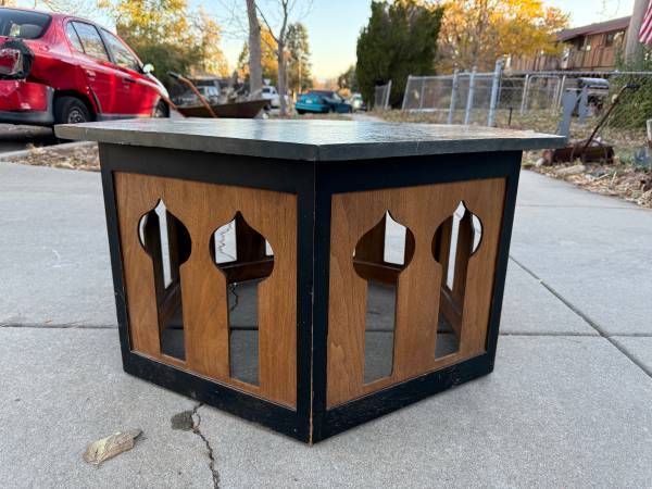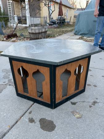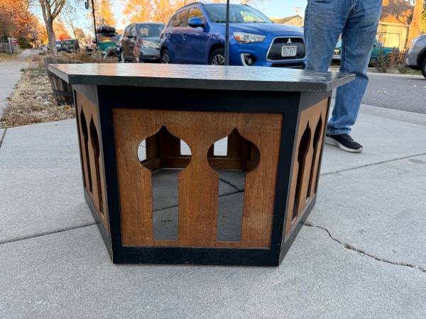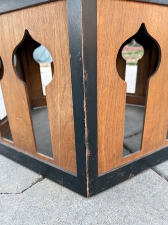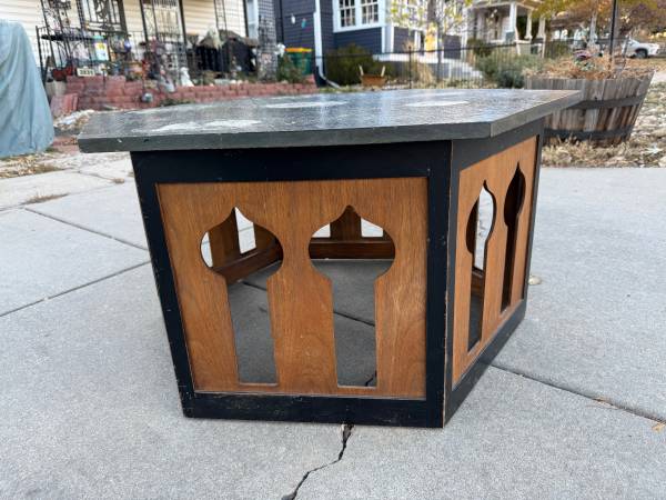 Hi, I have a Vintage Mid Century Moroccan Style with Sculptural Slate & Walnut Octagon End Table for sale. It is still in good shape. It does have some stains on the slate. It was used as a plant stand. I am not sure what brand it is. Very unique end table. It does have some wear. The edges are missing some of the black. It does have some scratches and nicks.