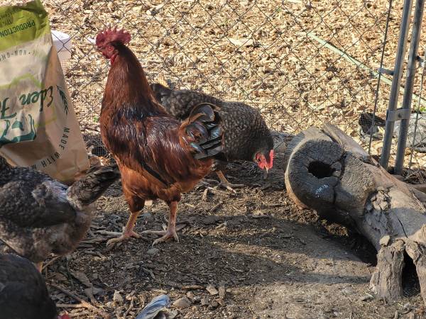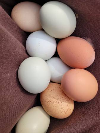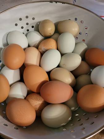 Beautiful color mix of chicken hatching eggs. All my birds run together so they're a beautifully colored barnyard mix. Easter egger, olive egger, barred rock, penedesenca, orpington, welsummer, barnvelder, Marans, and more. Under Easter Egger and Chocolate Egger roosters. One dozen for $25, assorted color mix. Birds eat no-corn, no-soy feed plus grass, weeds, herbs, etc. I don't ship.