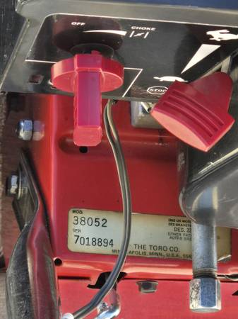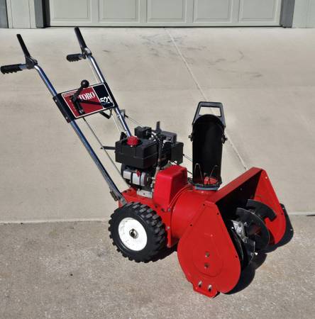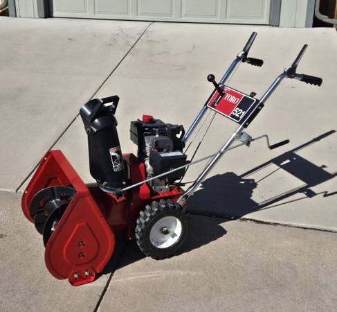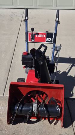 up for sale is a Toro 5/21 two stage snow blower. Fresh oil, new spark plug, fuel line, primer line, skids, scraper bar, and carb clean. Has the toro solid no flat tires, three forward speeds, one reverse. Starts right up with electric start and pull cord and runs great. Sold as is.