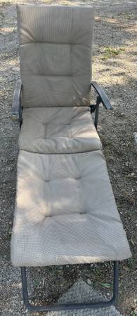 Two low-level foldable yard lounges. Beige colored one-piece stuffed fabric cushion. Nice condition. Clean. $20 each.