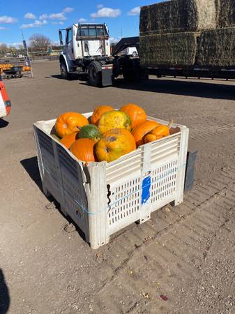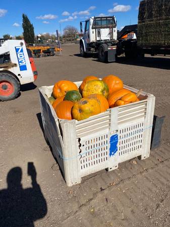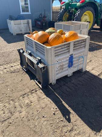selling left over bins of pumpkins average weight 700lbs. for $65 bin. We keep the bins you get the pumpkins. Great organic natural de wormer and food source for livestock. High in protein great substitute for grass, alfalfa, oat, sudan sorghum, tritacale, straw, millet food source for cow, cattle, horse, sheep, lamp, goat pigs, pig, sow, boar, turkey, chicken, or livestock. limited bins left first come first get. Purchasing 4 bins or more $50 bin
